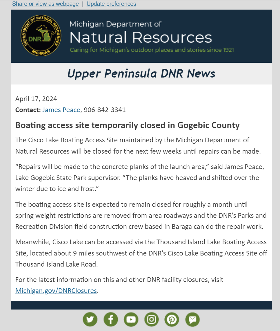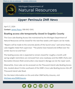 FYI: Boating Access Site Temporarily Closed in Gogebic County April 19, 2024 https://www.isccw.org/wp-content/uploads/2024/04/DNR-FYI.png Posted in Home Featured, News